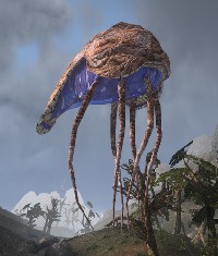 "These interesting creatures can be found floating through the skies of Morrowind. Looking like a particularly leathery jellyfish, Netches act like cattle, and are often treated as such by the people of Morrowind.